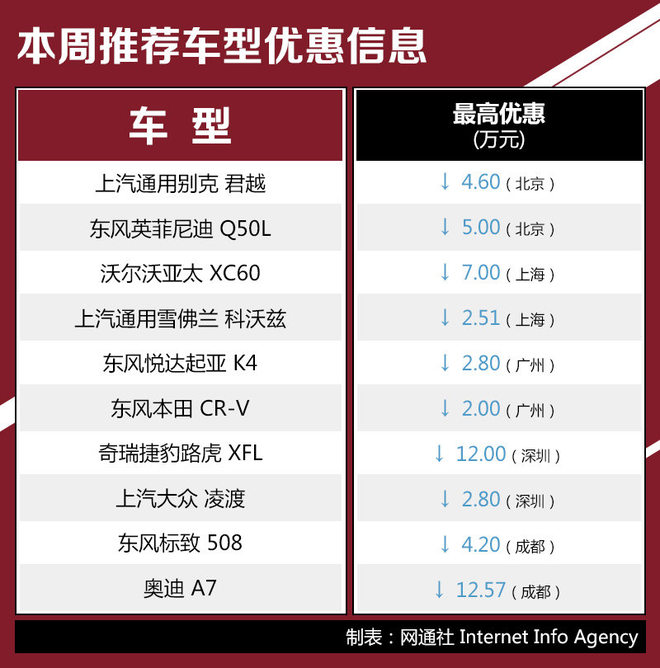 纵观7月第二周的各地市场,优惠幅度大的主力主要还是一些传统的三厢轿车和少量SUV,这其中就包括降价幅度比较大的奥迪A7 (配置|询价),也有如别克君越 (配置|询价)这样的中高端家轿。下面就让我们一一评说。(本文降价信息根据当地4S店当周报价信息汇总,只提供参考,具体优惠细节请到店咨询。)