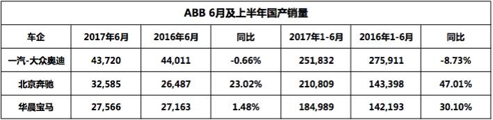 曾经被人们所熟知的ABB已经变成了BBA。今年上半年,奥迪、宝马、奔驰在华国产及进口的总销量完成了全新排序。曾经的老大哥奥迪,第一次失去在华半年销量冠军头衔;全系热销的奔驰第一次登上这一宝座;一心把宝押在全新5系上的宝马排在中间。