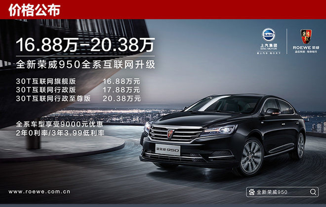 荣威现有阵容中的旗舰轿车——荣威950迎来了新款。网通社从上汽乘用车官方获悉,荣威全新950正式上市,共推出3款车型,售价区间16.88-20.38万元,其中上市新车的顶配车型相较2015款顶配车型下调了8.6万元。新车搭载2.0TGI涡轮增压发动机,并配备了上汽与阿里巴巴联合研制的智能互联系统,并配备了ADB矩阵式LED大灯等高科技配置。