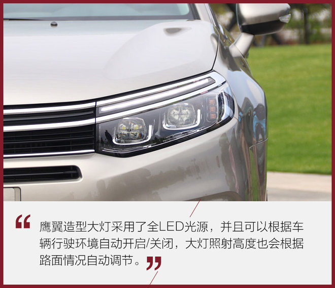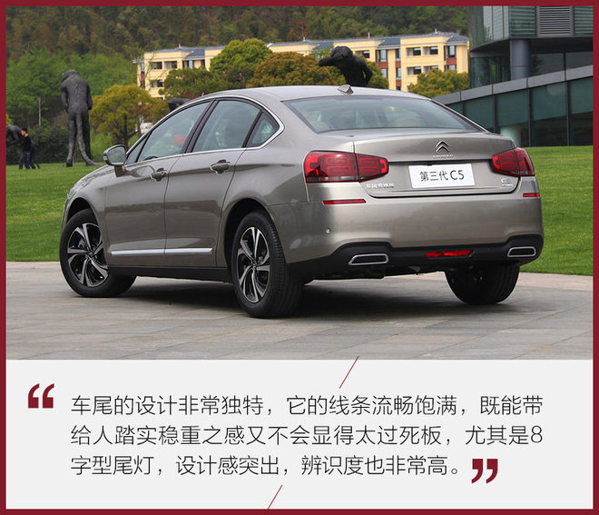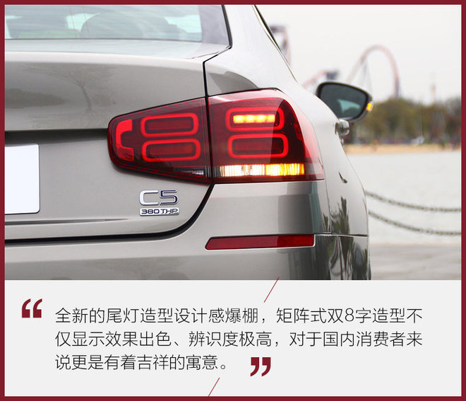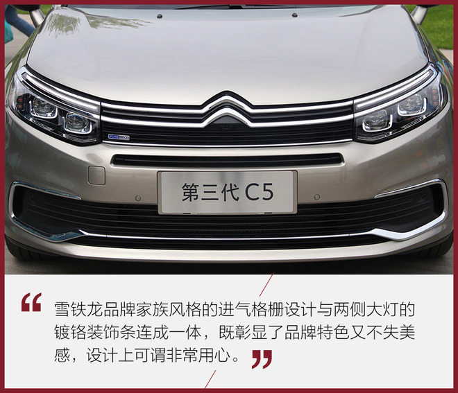 不难看出,全新一代C5的外观设计既保留了独特的品牌元素又与现代潮流相结合,大气稳重不失典雅与精致。它的外部配置也非常丰富,不论是极富科技感的自动调节大灯还是触摸式无钥匙进入按钮,亦或是大量的高科技辅助安全配置,都让它有了总统座驾般的品质。