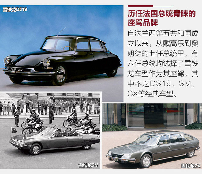 尽管法国并不止雪铁龙一个汽车品牌,不过雪铁龙毫无疑问是法国历任总统座驾车型中出现频率最高的品牌。除了上图中提到的DS19、SM和CX等经典车型外,DS23和XM等车型也一度是法国第三任总统德斯坦和第四任总统密特朗的座驾。甚至在中法建交50周年时,法方为中方领导人安排的接待座驾也是雪铁龙C6,足以见得雪铁龙在法国政府和高层中受到的青睐。