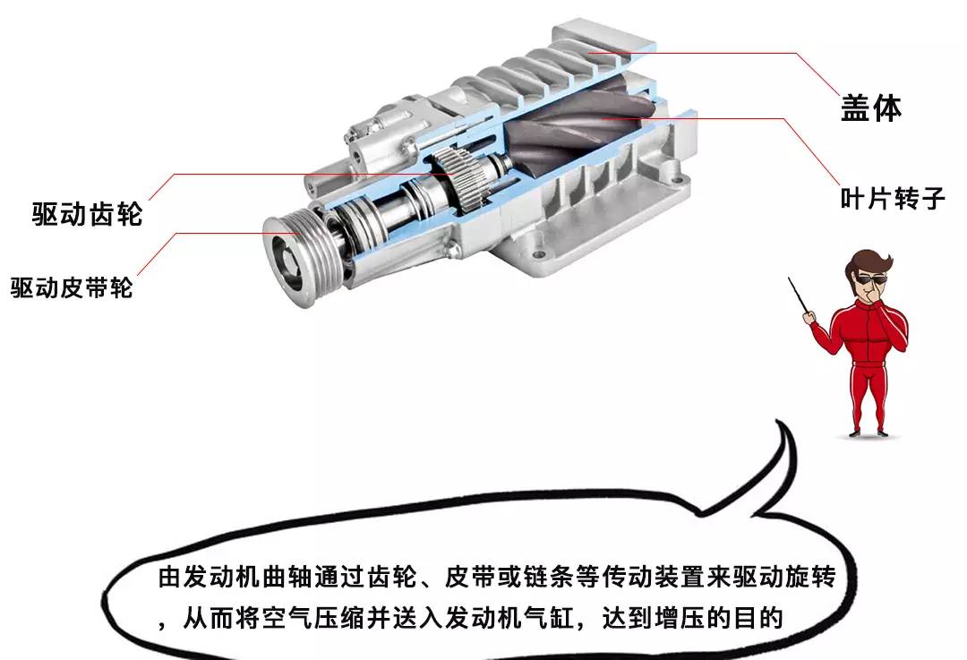 与涡轮增压不同的是,机械增压的工作原理就好像送风机。当发动机启动后,发动机曲轴转动通过皮带或者链条来驱动增压器,机械增压器的旋转转子将空气压缩,再将大量空气压缩通入燃烧室,借此提高引擎动力输出。