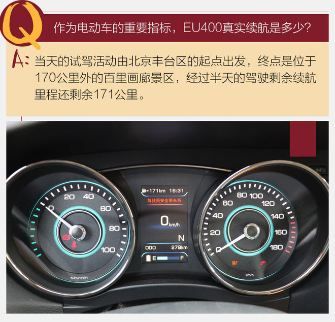 本次试驾活动的路线是由位于北京南三环丰台区的北京鸿都北汽新能源4S店出发经过城市道路和高速路况后,到达位于北京延庆县的百里山水画廊景区,单程全程大约170公里左右,我们中途不进行充电通过往返驾驶体现EU400的真实续航水平。
