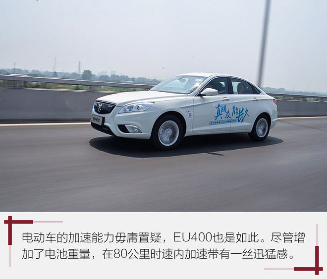 电动车在80公里的车速内加速度自然是不用担心的,这台EU400也是如此。在试驾当天我们车内乘坐了4名乘客,在红绿灯起步时依旧会爆发出不错的加速度,这一点令人感动非常欣慰。