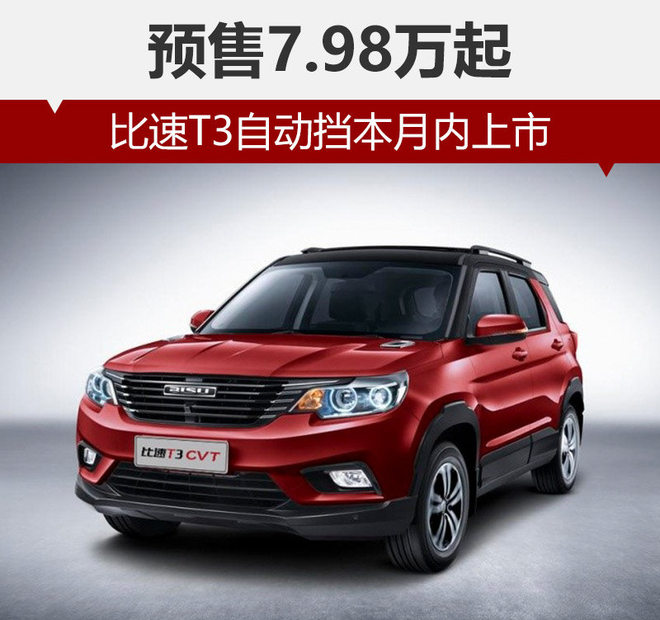 比速T3是比速汽车旗下的首款SUV车型,于去年12月正式上市,前期车型仅配备手动变速箱。网通社从比速汽车官方获悉:比速T3自动挡车型正式开启预售,共推出3款车型,预售价区间为7.89-8.99万元。新车外观内饰均与现款车一致,搭载1.3T涡轮增压发动机并匹配一台CVT变速箱。另据了解,比速T3自动挡有望于本月内正式上市。