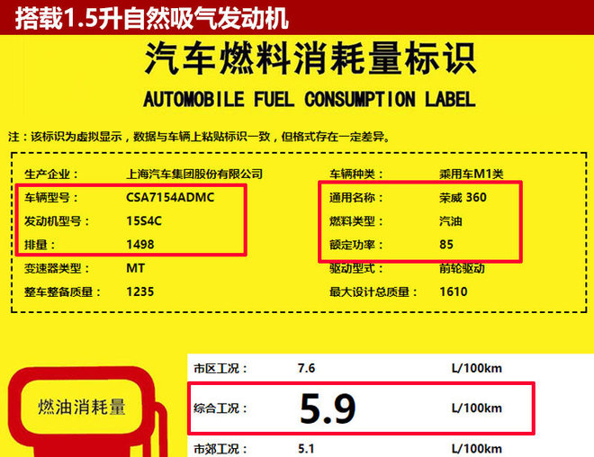 从国家工信部公布的信息可知,上汽荣威新款360将搭载一台重新调校的型号为15S4C 1.5升自然吸气发动机,额定功率提升至85千瓦,百公里综合油耗5.9升。