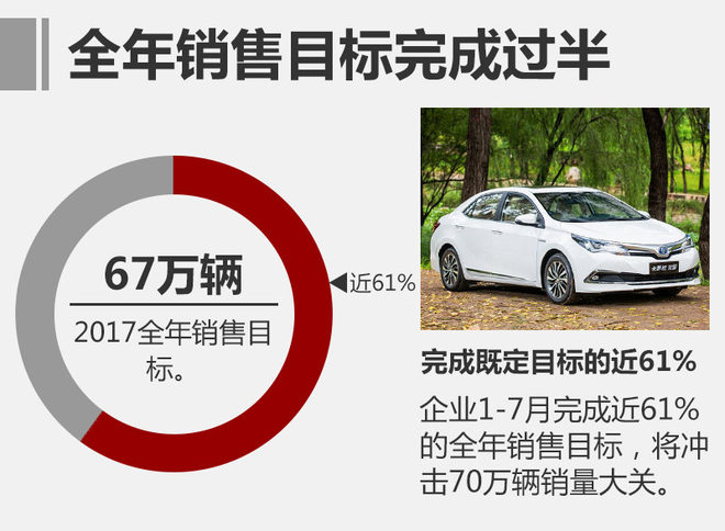 进入2017年以来,一汽丰田在销量上保持持续增长态势,今年1-6月企业总销量达到34.5万辆,已完成全年既定销售目标67万辆的51.6%。而在7月,企业继续保持稳定增长。网通社从一汽丰田官方获悉,企业今年7月销量接近6万辆,其中,卡罗拉 (配置|询价)家族表现抢眼,7月销量超过3万量。