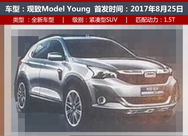 这款小SUV外观采用全新设计的运动保险杠,配合上方粗犷的镀铬饰条,整体彰显大气;动力上将搭载一台1.5T发动机。观致全新品牌“Model Young”定位低于目前在售的车款,目标群体是年轻消费者。“Model Young”产品将与奇瑞共享平台技术,未来将覆盖轿车、SUV及电动车领域。
