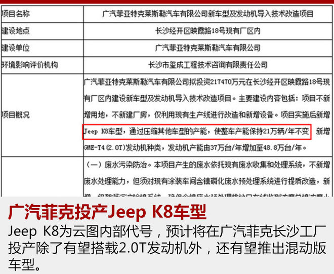 5月中旬,网通社从湖南省环保局获悉,Jeep将新增K8车型并在长沙工厂投产。据悉,这款代号为K8的车型即为Jeep云图。该项目文件中还透露道,广汽菲克将新增GME-T4(2.0T)发动机种类,这款发动机未来将陆续搭载国产Jeep等车型中,云图或搭载。除了传动燃油动力外,新车也将有望遵循概念车的设计理念,搭载一套混合动力系统。(图/文 网通社 徐晓晨)