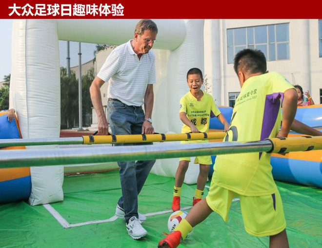 为建设和营造积极向上的足球文化,让公众切身感受足球运动的乐趣,此次夏令营还特设了“大众汽车足球日”,设置创意足球游戏环节,从而让公众在互动体验中享受足球魅力。真人版桌上足球争霸挑战赛、泡泡足球挑战赛、姿势拍照挑战、争锋对垒障碍挑战等多种项目,让在场嘉宾和小球员们一起带球穿越层层障碍关卡,体验足球活动的趣味。(图/文 网通社 裴健如)