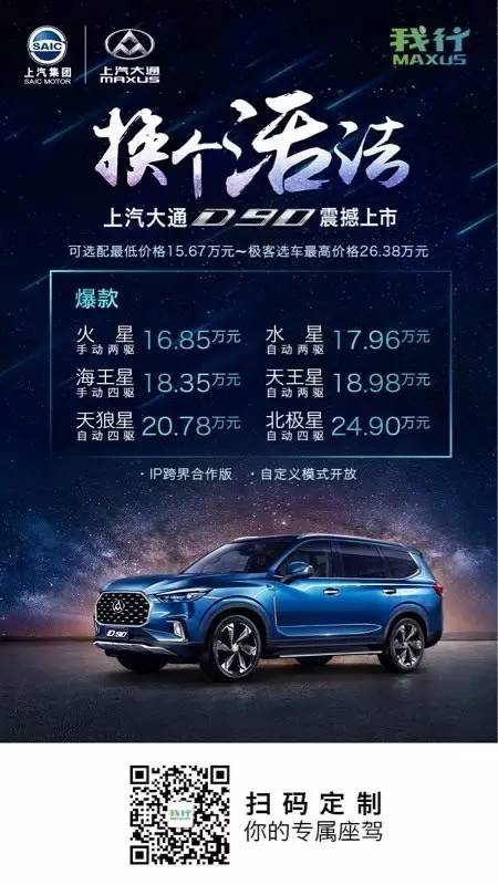 8月8日,上汽大通首款SUV车型D90正式上市,新车定位中大型SUV,推出2.0T发动机1种动力共6款固定车型,同时可支持个性化定制,实际售价区间为15.67万-26.38万元,并且提供终生免基础流量、终生质保服务。