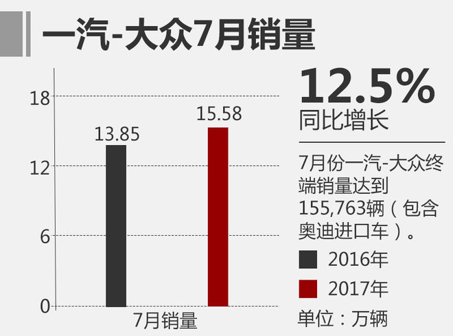 今年上半年一汽-大众交上了一份不错的期中答卷,7月份,一汽-大众以强劲的市场表现为下半年赢得一个良好的开局。网通社从一汽-大众官方了解到,今年7月份,一汽-大众终端销量达到155,763辆(包含奥迪进口车),同比增长12.5%,再次摘得国内乘用车市场销量冠军。不仅如此,一汽-大众旗下的两大品牌(大众和奥迪)也纷纷实现两位数的增速。