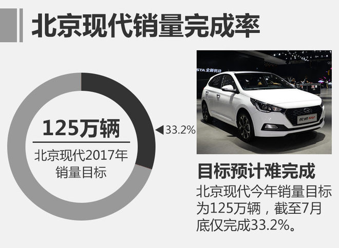 北京现代2016年全年累计销量114万辆,并在2017年初定下125万辆的目标。1-7月份,北京现代实现41.5万销量,仅完成全年目标的33.2%。此外,北京现代副总经理、销售本部副本部长吴周涛此前接受采访时表示,将在10月份的15周年庆时宣布下调销量目标。(图/文 网通社 张朦)