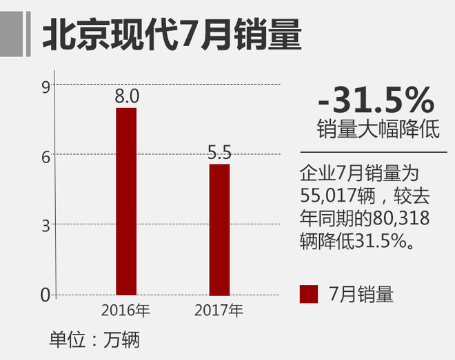 继今年1、2月份北京现代销量持续增长之后,企业从3月份开始,销量表现一直处于降低的状态。今年7月,北京现代销量为55,017辆,较去年同期的80,318辆降低31.5%。截止7月底,北京现代已经连续5个月出现负增长的情况,低迷的市场表现还在延续。