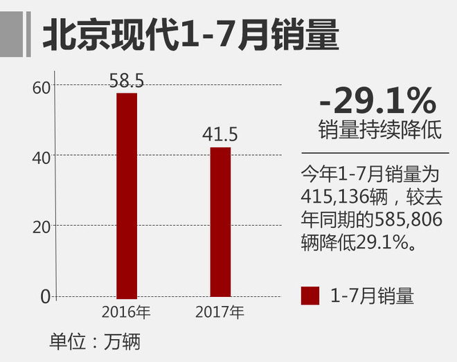 2016年北京现代全年累计零售销量为114万台,同比增长7.5%,完成目标。而进入2017年后,北京现代的销量表现十分低迷,今年1-6月份累计销量30.1万辆,同比降低42.4%。网通社从全国乘联会获悉,截止7月底,北京现代2017年累计销量为415,135辆,同比降低29.1%。