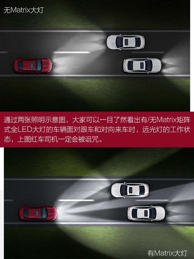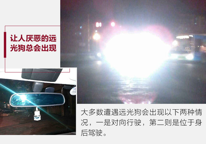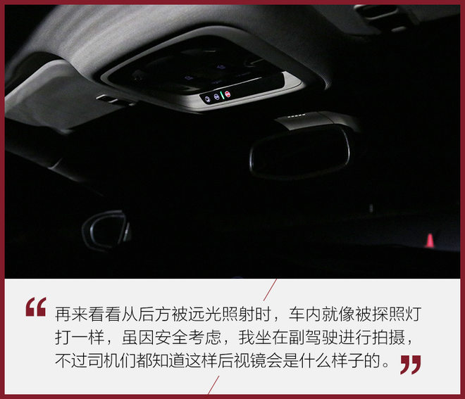 在遭遇远光狗时总会出现上图中的两种情况,前者会让司机完全看不见前方的道路;后者则是无法从后视镜中了解后方情况,还会被照的车厢内“灯火通明”,不管发生哪种情况,都会出现很大的安全隐患,此次我们也通过对比来体验装有Matrix矩阵LED大灯的全新君威和安装普通氙气大灯的车型,开启远光后,对于他车的不同影响,当然作为体验者,我是被晃的。