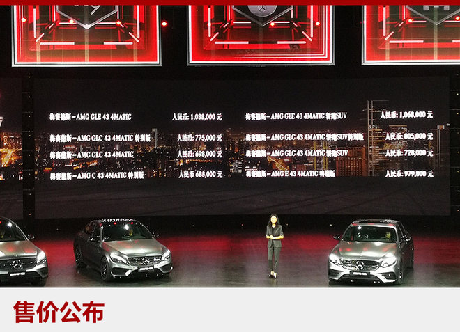 AMG品牌具有较高的动力和良好的操控性,在2017年更是推出11款新品供消费者进行选择。网通社从梅赛德斯-奔驰官方获悉,梅赛德斯-AMG旗下的全新43系列车型(包括AMG C (配置|询价) 43、AMG E 43、AMG GLC (配置|询价) 43、AMG GLE (配置|询价) 43 以及Coupe车型在内的8款新车)正式上市。此次上市的新车均配备3.0升双涡轮增压发动机,售价区间为68.8-106.8万元。
