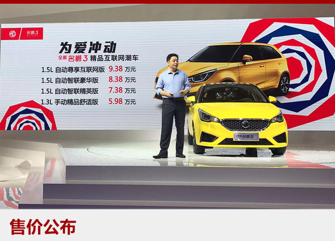 MG3是名爵品牌旗下一款小型车,年轻的外观、英伦的设计吸引了不少年轻人的喜爱。网通社从上汽名爵官方获悉,新款名爵MG3正式上市,新车共推出4款车型,售价区间为5.98-9.38万元。新车采用新的家族式设计语言,星跃骑盾式进气格栅配合内凹的网格设计,突出中间MG品牌标识。同时,新款MG3还将搭载由上汽和阿里巴巴联合研发的“斑马智行系统”,支持智能地图、一键拍摄分享、超级车队等功能。