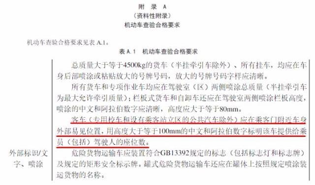 《机动车运行安全技术条件》规定:所有客车(专用校车和设有乘客站立区的公共汽车除外)应在乘客门附近车身外部易见位置,用高度大于等于100mm的中文及阿拉伯数字标明该车提供给乘员(包括驾驶人)的座位数。