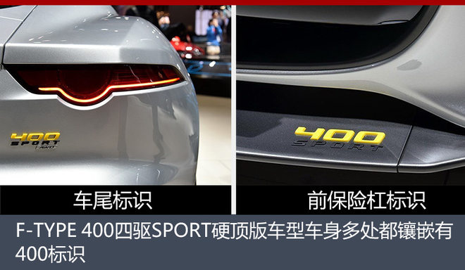 尾部方面,新款F-TYPE SVR车尾采用了新的后包围设计,尾部使用了双边共四出的排气布局,配合大尺寸的后扰流板,看起来运动感十足。F-TYPE 400四驱SPORT硬顶版车型则是在前保险杠、车尾部以及刹车卡钳等部位都标有400的标识。