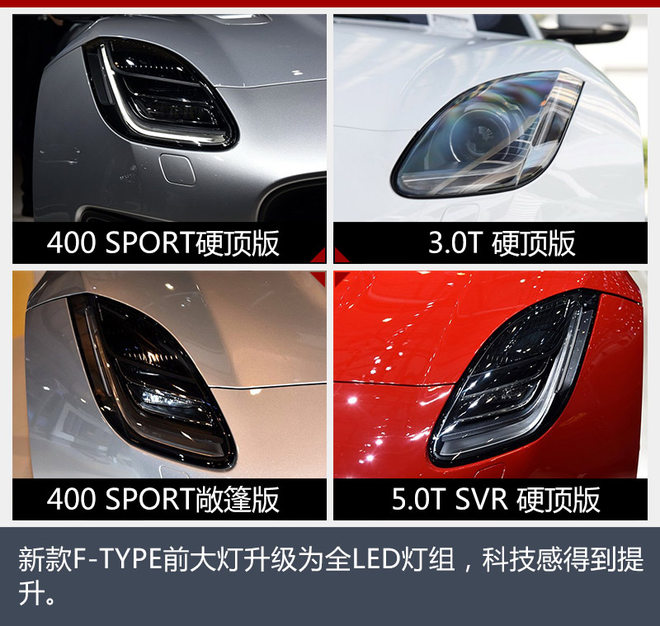 外观方面,新款F-TYPE相比现款车型并没有做出较大的变化,只是对部分细节进行了调整和升级,对于不同车型的前进气格栅以及前包围样式都进行了单独的调整,前大灯升级为全LED灯组,科技感得到提升。此外,新车的后保险杠也进行了重新设计。