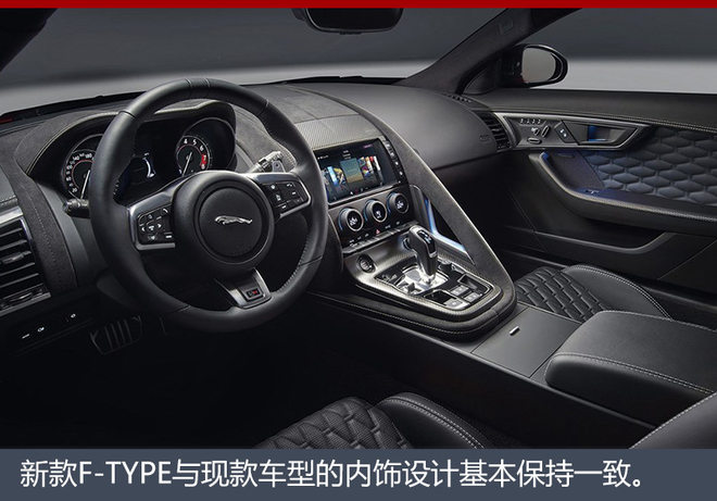 内饰方面,新款F-TYPE与现款车型的内饰设计基本保持一致,中控完全是为驾驶员而打造。内饰颜色依旧采用深色进行配色,400四驱系列的车型还特别装配了一款更加轻量化且符合人体工程学的座椅,并且也标有400的标识,这不仅让内饰能够充满运动氛围,更让驾驶者坐在车内就有想要驾驶它的欲望。