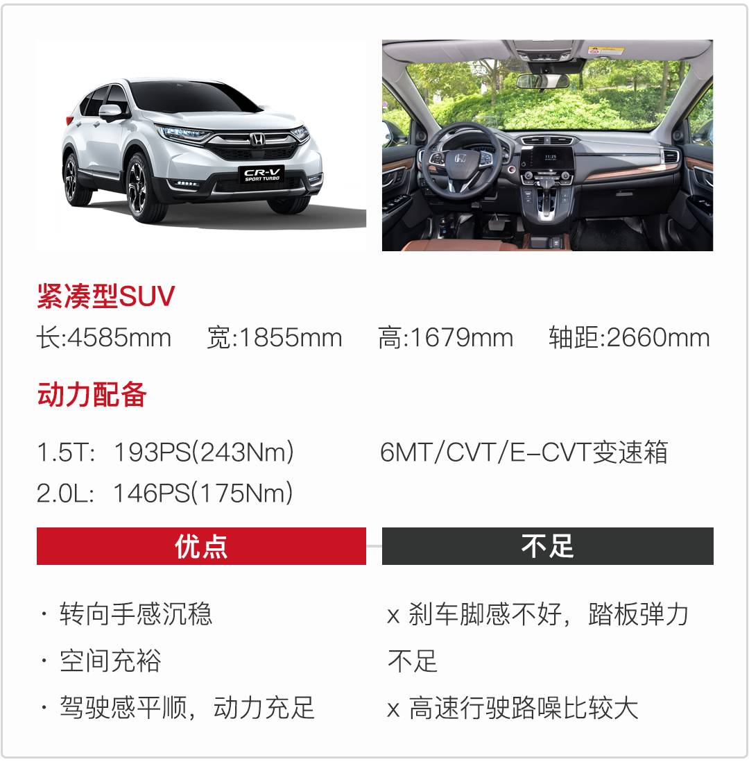 在最近上市的本田CR-V (配置|询价)无疑引起了大部分准车主的关注, 新一代CR-V延续了上代车型各项表现均衡的特点,在这个价位里面算是王者级别的存在。新车的外观也是根据现在年轻化的趋势做出了改变,前脸富有力量感的线条,搭配上更大的镀铬装饰条,尾部采用全新设计的L型尾灯,更具视觉效果。新车搭载1.5T,2.0L发动机(混动版本),1.5T发动机跟CVT变速器的匹配达到了很高的水平,行驶起来非常平顺,动力表现也让人满意。转向手感比较沉稳,并没有某些人口中所说的“日系飘”。底盘的调校也比较舒适,大大小小的震动都能很好过滤。然而,车无完车,CR-V行驶时路噪还是比较大的,另外刹车踏板的回弹力不足,踩刹车的力度比较难把握,市区走走停停驾驶的时候还是比较容易疲劳的。