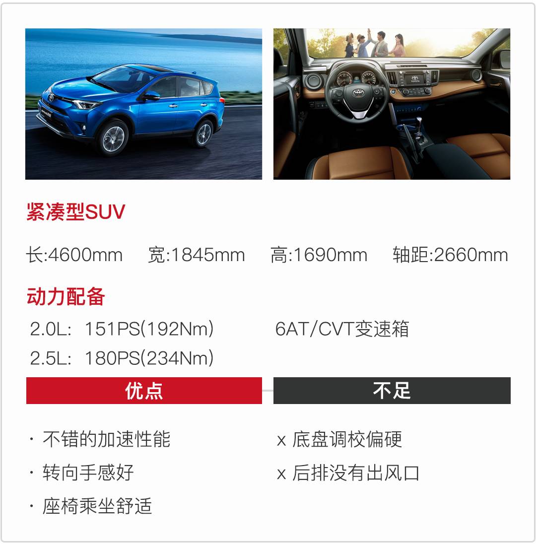 荣放也实力不俗,在这个级别的市场里面也积累了一定的口碑,俗话说,开不坏的丰田,品质是大家有目共睹的。荣放车身线条比较凌厉,迎合了现在汽车市场年轻化的趋势,内饰采用双色设计,层次感强,还是很耐看的。但是全系没有配备后排出风口,这是一个不足的地方。发动机跟变速器匹配很好,驾驶过程中感觉平顺,转向手感建立得挺不错,在操控上能给驾驶者较大的信心。底盘调校比较硬,因此在滤震性比较差,纵然整车的座椅舒适度高,但是因为过硬的底盘调校而使乘坐舒适性大打折扣。乘坐空间能够满足日常需求,并且全系标配全尺寸备胎,这个配置还是比较吸引人的,实际上在日常使用中,全尺寸备胎带来的后备箱地台凸起也是一个值得注意的地方。