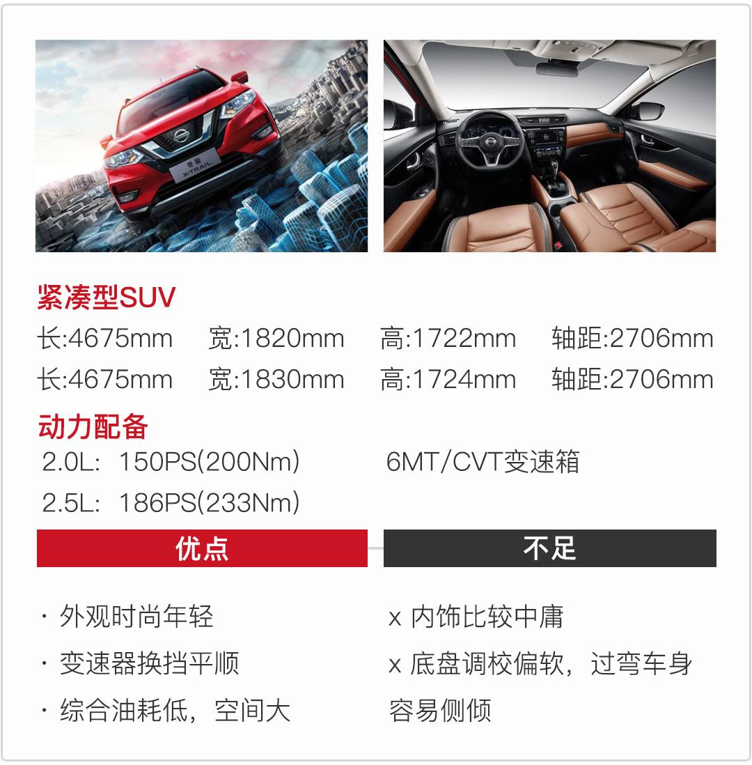日产奇骏 (配置|询价)相信大家都很熟悉,凭借着日产成熟可靠的技术,它已经是个久经沙场的老将了。奇骏外观采用了日产最新的设计语言,相比于老款更加年轻时尚,底盘调校柔软,因此带来了良好的滤震性,在驾驶中油门给人的感觉比较灵敏,前段输出比较足。内饰采用撞色设计增添了一定豪华感,中控屏幕下的按钮比较多,分布比较零碎,操作起来不是很方便。后排空间还是很充裕的,毕竟有着“日产大沙发”的称号,乘坐舒适性不会差。但是后排坐垫偏短,支撑性不是很足,还是推荐大家有机会去试乘。值得一提的是,奇骏的四驱版本在日系三巨头中的越野能力是最强的,因为其四驱系统配备了中央多片式离合器的差速器,在路况较差时的脱困能力是很强的,而且现在奇骏也是有优惠的喔。