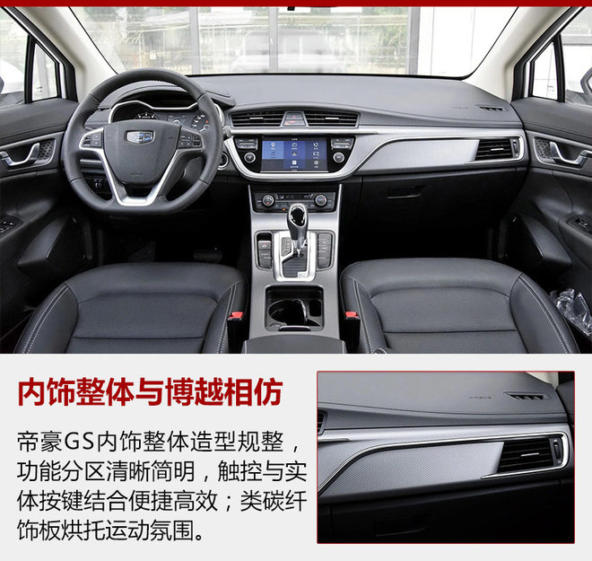 帝豪GS整体内饰造型与此前上市的博越有诸多相似之处,大尺寸中控屏两侧集成触控式按键,中控台与换挡机构及下方储物格形成弧形线条,视觉上更加协调;多处细节处采用仿碳纤维饰板装饰,为内饰营造出了运动化氛围。皮质平底多功能方向盘在三、九点出布置凹槽,提升驾控握感。