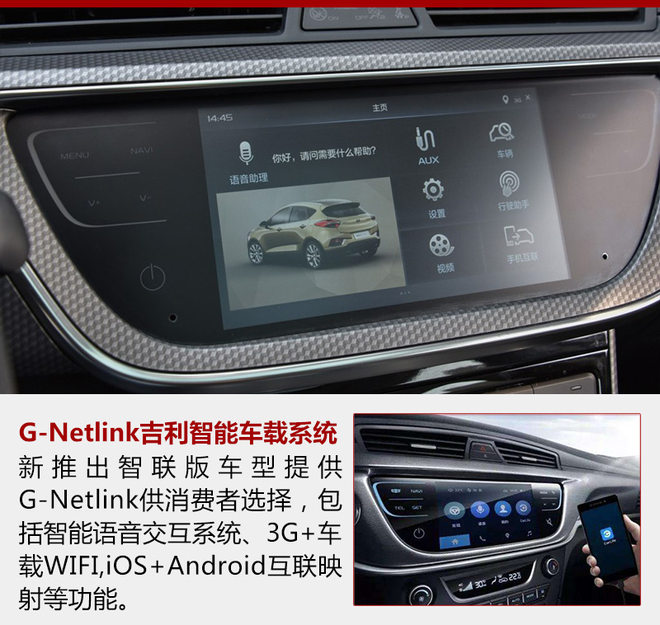 帝豪GS智联版可在中控台选装一块互联大屏,内嵌G-Netlink吉利智能网联系统,系统内整合“你好,GS”智能语音交互、3G+车载Wi-Fi、GPS导航、CarPaly、车载蓝牙、iOS+Android手机智能互联、多媒体影音等时尚功能。