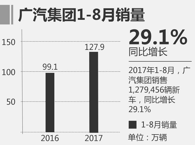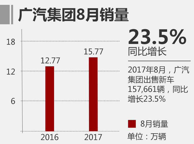 根据广汽集团公布的产销快报可知,2017年8月,广汽集团共出售新车157,661辆,与去年同期的127,697辆的销量数据相比,增长了23.5%。而1-8月,该集团累计销量达到了1,279,456辆,与去年同期销售990,735辆新车相比,增长了29.1%。