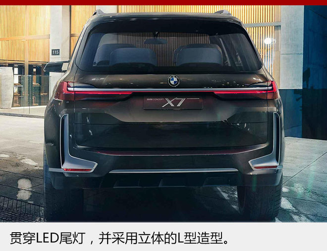另外,车身尾部不仅运用隐藏排气尾喉的设计风格,还增搭当今流行的L造型贯穿LED尾灯。后尾门线条饱满,加上车身侧面以及车门上的腰线,肌肉感十足。另外全新宝马X7插电混动概念车首次在车轮拱罩的边缘采用半圆造型,强调车辆的尊贵感和侧翼的优雅气质。