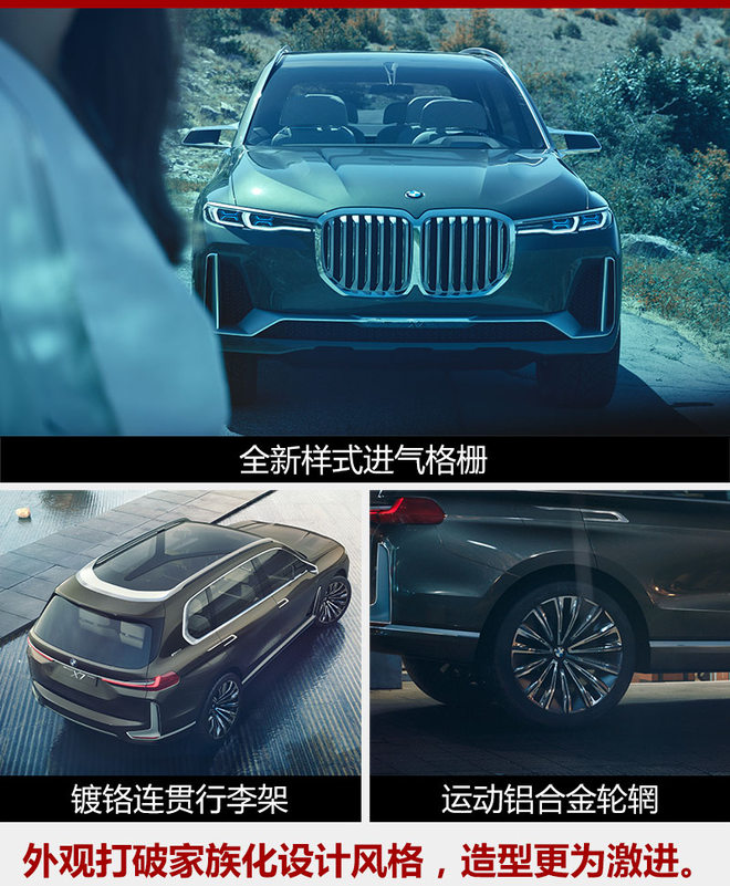 作为公司全新“第一战略”的一部分,宝马集团将通过拓展大型豪华车产品阵列,提升销量和收入,X7就是在该战略下打造的最强大产品攻势中的一款重磅车型。宝马集团在法兰克福车展前公布了一套全新X7插电混动车型的官图,网通社从官方获悉,新车将采用6座座椅布局方式,并配备全透明车顶。另外,全新宝马X7 (配置|询价)插电混动车产版本将在2018年正式推出。