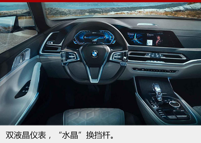 未来将作为旗舰SUV推出的全新宝马X7插电混动概念车在内饰的设计上自然不会“普通”。多功能方向盘多处采用镂空设计以及镀铬装饰,正前方两块12.3英寸全液晶显示仪表,突出该车尊贵的身份。另外,全新宝马X7插电混动中控台的设计,终于脱离宝马家族化设计风格,大面积触控按钮的采用,科技感瞬间提升。