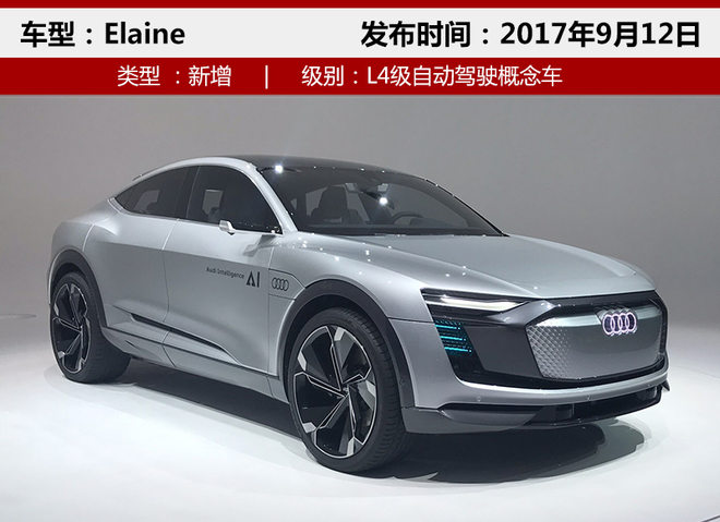 全新Elaine是一款基于此前发布的e-tron Sportback概念车打造的全新自动驾驶概念车,新车长4.9米并定位为一款轿跑SUV。外观设计上Elaine延续了e-tron Sportback的设计风格,全车线条突出,渐进式照明光源给人眼前一亮,夜间辨识度也较高,科技感十足。同时,该车还搭载了与奥迪e-tron Sportback相同的三台电动机,全时四驱系统搭配后可输出370千瓦最大功率。