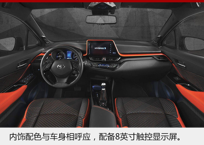 新车内饰配色与车身相呼应,采用黑色+橘色撞色设计。同时,丰田C-HR Hy-Power概念车配备真皮包裹的三辐式多功能方向盘和8英寸触控显示屏,仪表使用了双圆盘式设计,中控台呈非对称式,整体设计较为简洁。