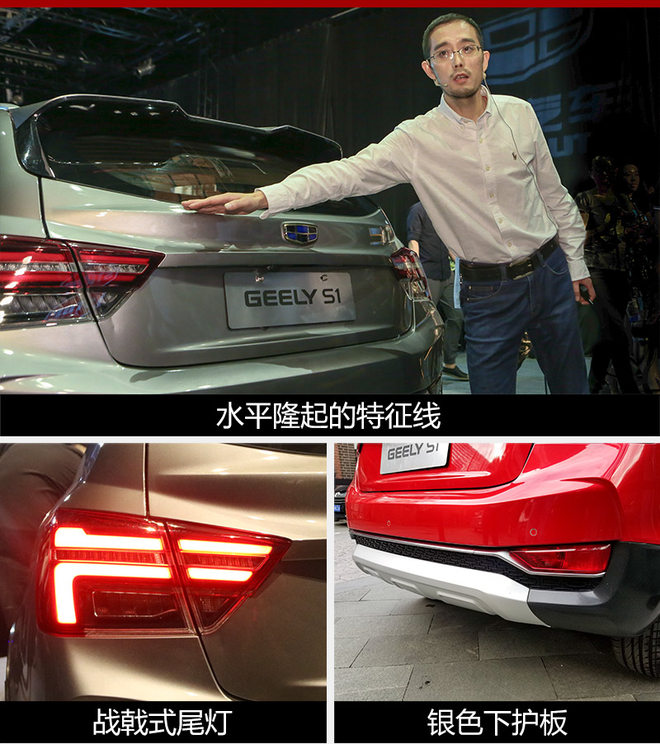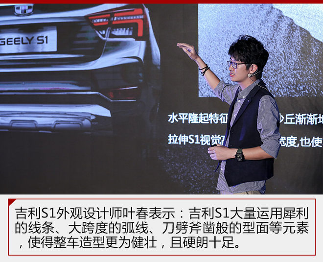 吉利中国设计中心设计经理范丽东表示:“通过符合空气动力学的流线型设计与刚硬坚挺的线条的合理运用,让S1拥有棱角分明的轮廓、锋睿有力的外形,又凸显出科技感和立体时尚感,这就是S1的新硬派,刚中见柔,柔中带刚。”