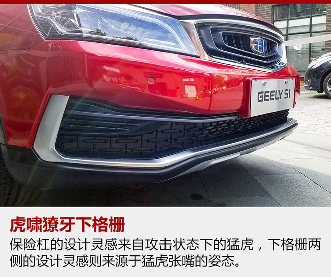 在保险杠的设计上,吉利S1依然充满了攻击性。据介绍,保险杠的设计灵感来自攻击状态下的猛虎,下格栅两侧的设计灵感则来源于猛虎张嘴的姿态。令前脸看起来更为凶悍,同时也更具跨界SUV的野性。