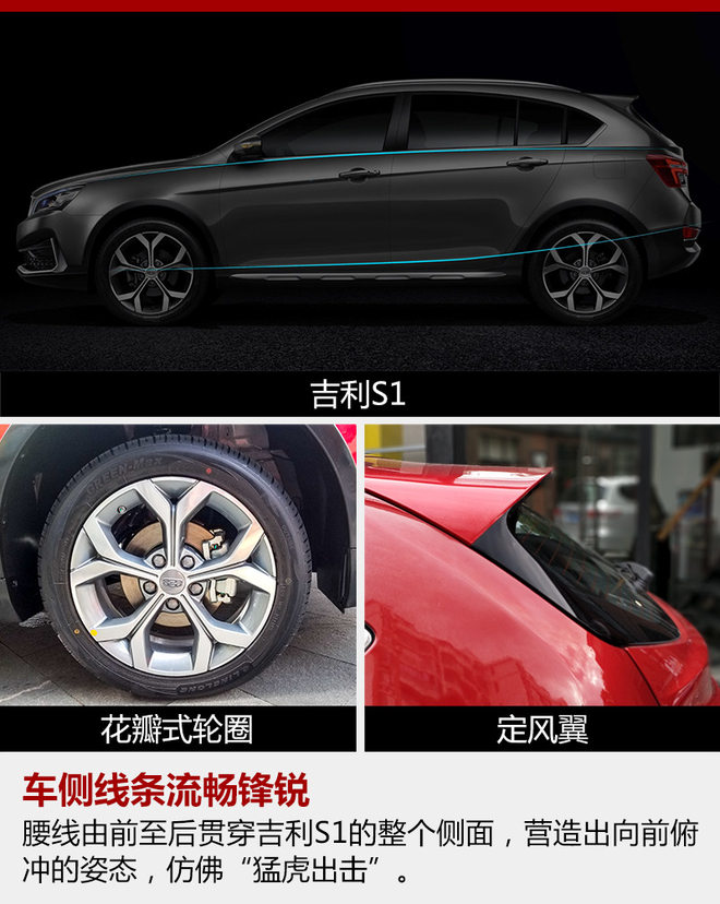 S1车侧线条流畅锋锐,由前至后贯穿吉利S1的整个侧面,营造出向前俯冲的姿态,仿佛“猛虎出击”。此外,花瓣形轮圈的每一片“花瓣”均拥有“钻石切割”的棱角,也从侧面表现出“刚柔并济”的设计理念。