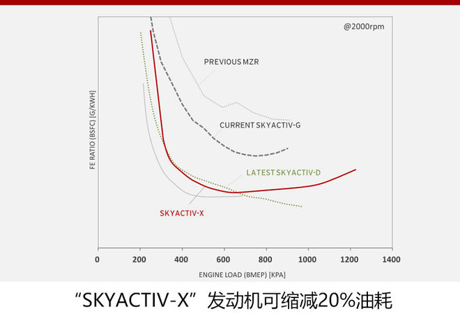 在油耗方面,与现款创驰蓝天汽油发动机相比“SKYACTIV-X”可缩减20%油耗。另外,在低车速使用频率较高的地区可以使用超稀薄燃烧,所以这一数字还可以提升到30%。对比2008年时马自达的发动机技术,已经达到35-45%的飞跃性改良效果,可以达到与马自达最新创驰蓝天柴油发动机“SKYACTIV-D”升级版同等水平的油耗。因为轻负荷区域的油耗改善率较大,推翻了目前大排气量等于高油耗的固有概念。