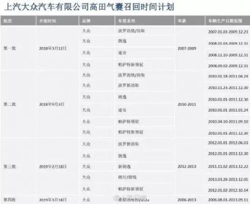 大众,全球汽车巨头,国内神级汽车车企。无论走到哪,我们能看到的车型当中可能5辆就会有1辆甚至2辆是大众,不管是我们坐过的出租车、考驾照时候练习的教练车还是日常生活中购买的车,都无一例外的被上海大众、一汽大众所包办。没错,大众在中国就是这么一个数量庞大的汽车品牌,丰田比不了、本田比不了、日产比不了、别克同样比不了,可以说当今没有一家车企能真正比的了大众。可是,就算是这样一家拥有强势霸主地位的车企,在9月14日也终于决定自2018年3月12日起分批次召回共计4,860,029辆大众汽车。而这其中既包含了进口大众也包含了一汽大众还有上汽大众的车型。其数量之多属大众集团乃至汽车召回史上之罕见,究竟是什么原因令大众低下向来高贵的头颅对多达486万辆的汽车实行召回呢?而令人万万没料想到的是,最大的原因竟然还是可怕的“杀人气囊”!