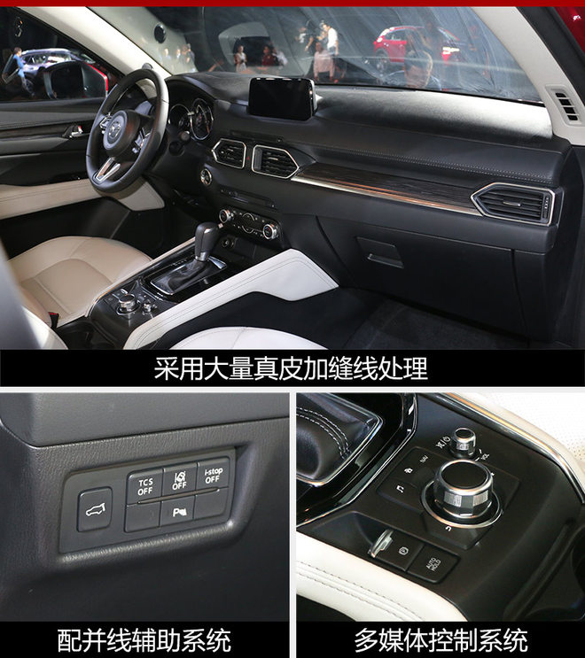 内饰方面,全新一代CX-5进行了重新设计,整体延续最新的家族式设计风格,钢琴烤漆搭配木纹饰板,提升车内质感。中控台上方采用7寸悬浮式触控屏,搭载MZD Connect多媒体系统。新车还提供全彩色抬头显示器、电子手刹、并线辅助、电动尾门等。