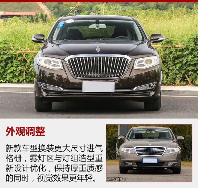 新款车型中网依旧采用类六边形设计,同时调整进气格栅尺寸;头灯组优化设计,整体面积缩小但却更加精致,突出线条感;雾灯区造型变动较大,同时加入横贯镀铬饰条。车身侧面维持现款风格,线条平直,造型厚重,契合其行政车型定位。