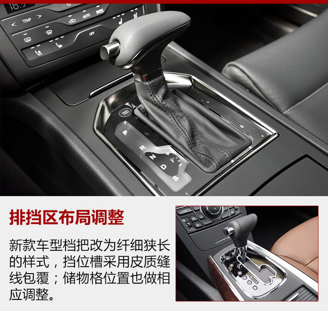 中控另一处显著变化是整个排挡区的重新布局,盖板式储物格由先前竖置改为平置;排挡区挡位槽由现款隔板覆盖调整为新款的皮革包覆。换挡握杆更为纤细狭长,贴合手型,将带来更为出色的持握体验。