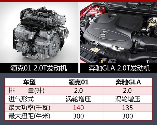动力方面,领克01高配版车型将率先搭载源自沃尔沃Drive-E系列的VEP4 2.0T涡轮增压发动机,该发动机的最大功率为140千瓦,峰值扭矩为300牛米。传动方面,与发动机匹配的为爱信6速手自一体变速箱。值得一提的是,同级别竞争对手奔驰GLA所搭载的同样是2.0T涡轮增压发动机,其最大功率为135千瓦,峰值扭矩也达到300牛米;通过对比后发现,领克01高配版车型在动力输出方面略占优势。