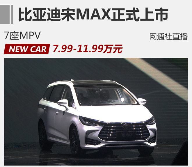 网通社从比亚迪官方获悉,宋MAX正式上市,共推出6款车型,售价区间7.99-11.99万元。新车采用了全新的“Dragon Face”式家族设计,搭载1.5T涡轮增压发动机。另据了解,企业未来还将推出纯电版以及混动版等车型。