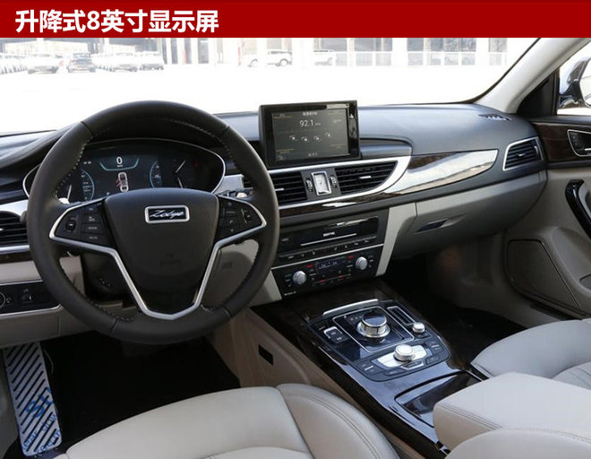 众泰Z700H内饰采用木纹饰板与镀铬饰条搭配,提升精致感。中控台配备升降式8英寸显示屏,配合旋钮式换挡机构,科技感十足;多功能方向盘采用真皮包裹,前方配有大尺寸液晶仪表。