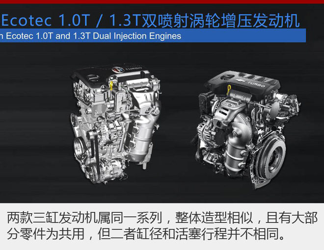 全新的Ecotec系列发动机共有两个排量,分别为1.0T和1.3T,都是三缸涡轮增压发动机。这两台发动机在同一系列中,自然有不少相同的零部件。但值得注意的是,这两款发动机的缸径和活塞行程这两个参数完全不同。直白地说,这台1.3T涡轮增压发动机并不是由1.0T发动机扩缸而来。