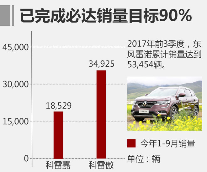 时间的车轮即将来到2017年的第10个月份,9月的最后一天,网通社从东风雷诺官方获悉,该品牌凭借国产双车的优异表现,在今年前3个季度累计销量达到53,454辆,完成全年必达销售目标近九成,距离“确保6万辆、挑战7万辆、争取8万辆”的全年目标仅一步之遥。